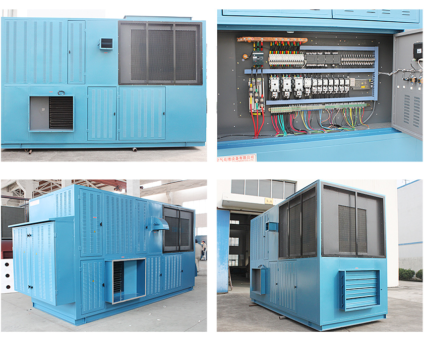 在噴涂車間的生產(chǎn)工藝中,有著嚴(yán)格的溫濕度要求,一般的要求為溫度 T ≤ 28 -30 ℃ ,相對濕度RH ≤ 40-50% 。同時(shí)由于這些場合又為高大廠房,且車間回風(fēng)含有油漆等有害揮發(fā)成份,不能回收,只能使用全新風(fēng)系統(tǒng)。因?yàn)橄募炯捌渌邷囟嘤昙竟?jié)的空氣中含水量較大,待處理的鋼鐵表面會(huì)均勻分布著細(xì)少的水滴,會(huì)直接影響到油漆在鋼鐵表面的附著牢度,嚴(yán)重的甚至是油漆不能直接附著到鋼鐵的表面。同時(shí),油漆噴涂后,干燥時(shí)間將大大延長,影響后續(xù)的生產(chǎn)工藝。特點(diǎn):制冷+除濕+加熱,常用風(fēng)量為:12000CMH、18000CMH、25000CMH。